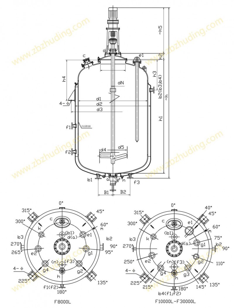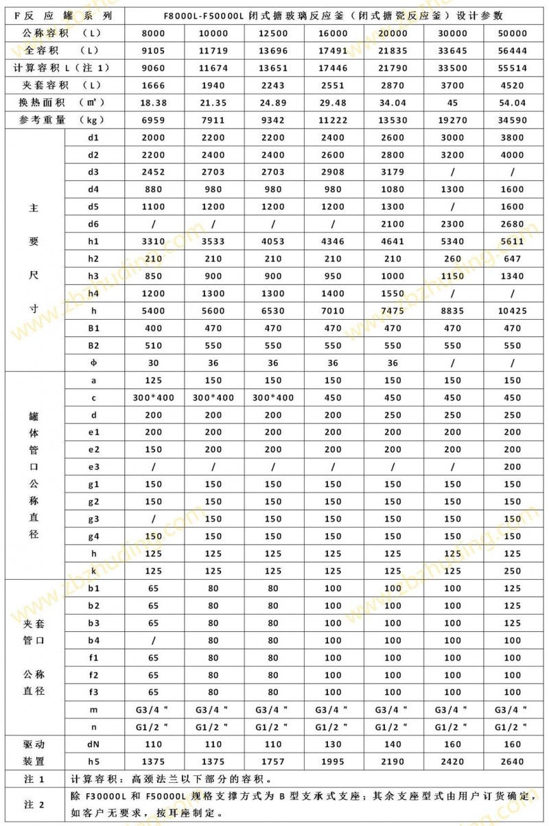 【F型搪玻璃反應(yīng)器的技術(shù)參數(shù)】: F8000L-F50000L閉式搪玻璃反應(yīng)釜(閉式搪瓷反應(yīng)釜)設(shè)計(jì)圖紙及參數(shù)如下所示: